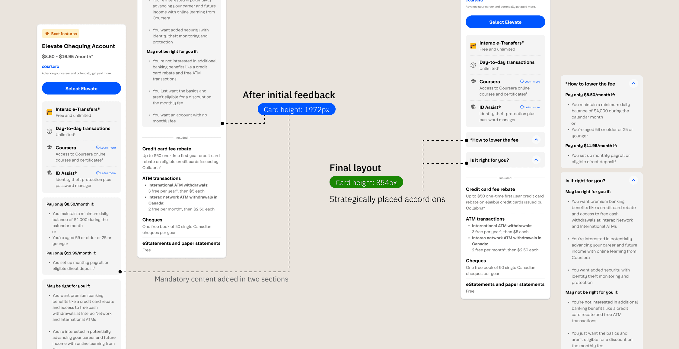 I worked with the content designer to reduce text wherever possible, made the account selection sticky, and organized dense information into meaningful accordions to avoid overwhelming users.