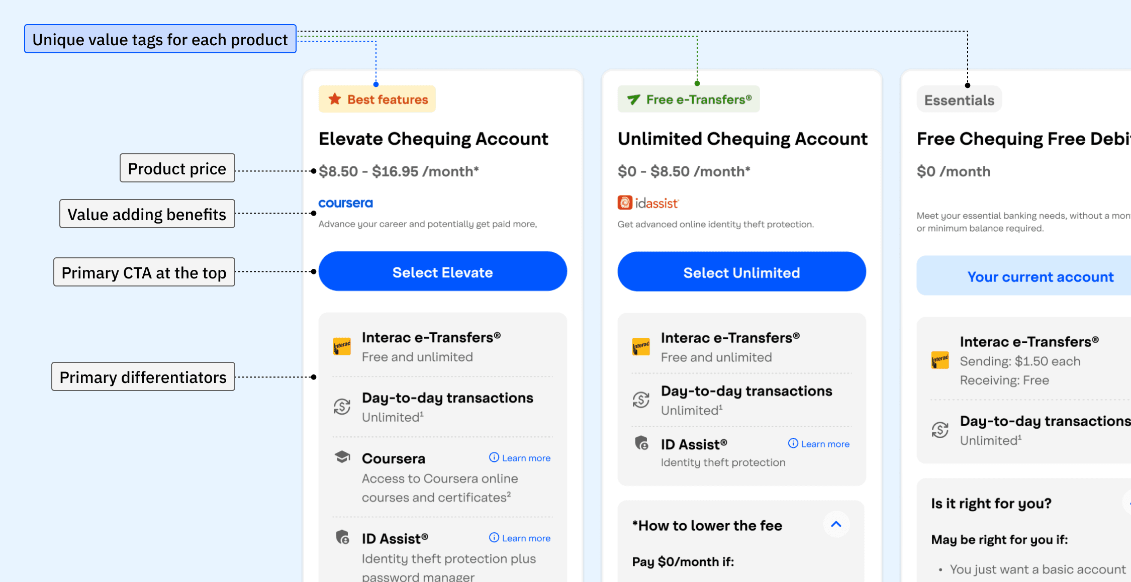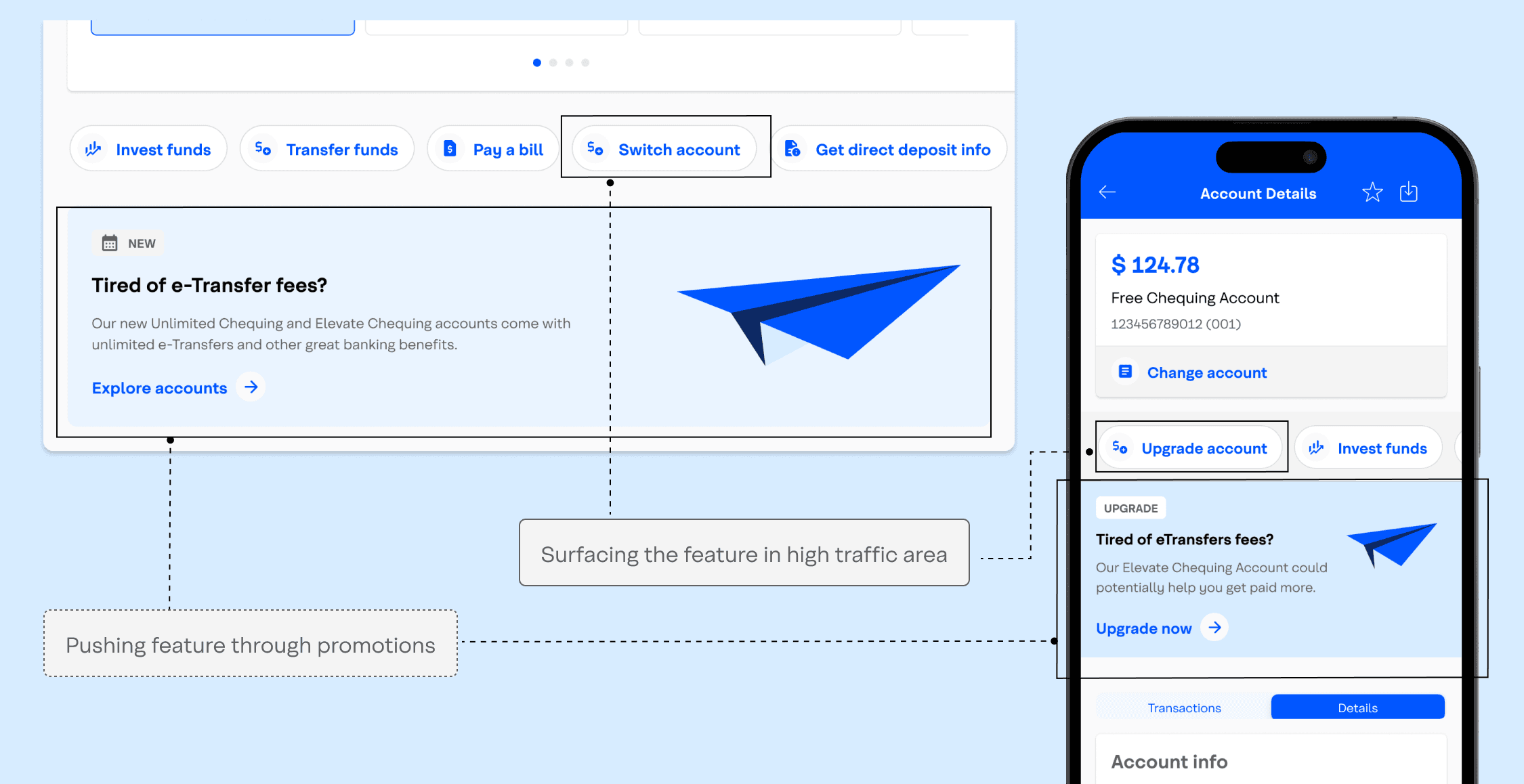 This feature release addressed key pain points, including long wait times when contacting the Advice Centre, frequent complaints about Interac e-Transfer charges, and the limited benefits of the base account tier.