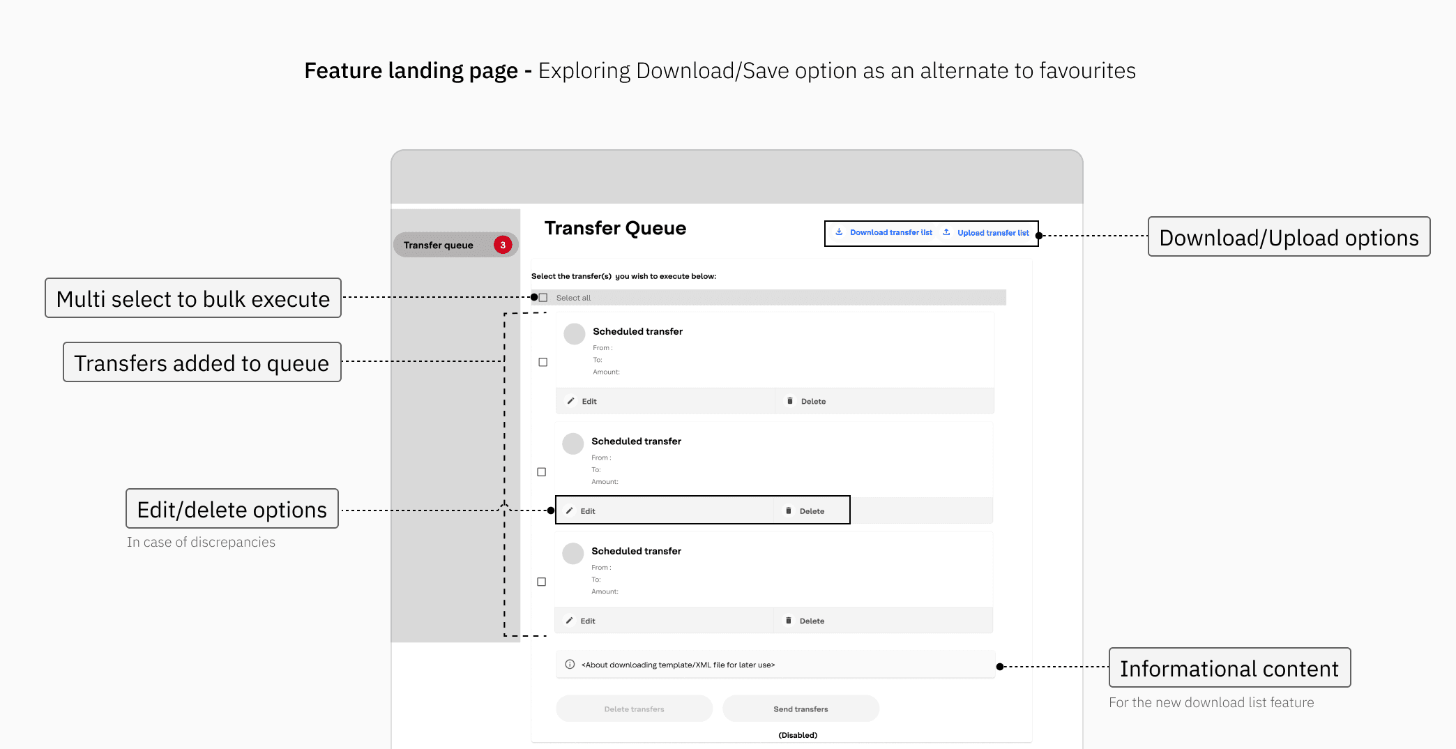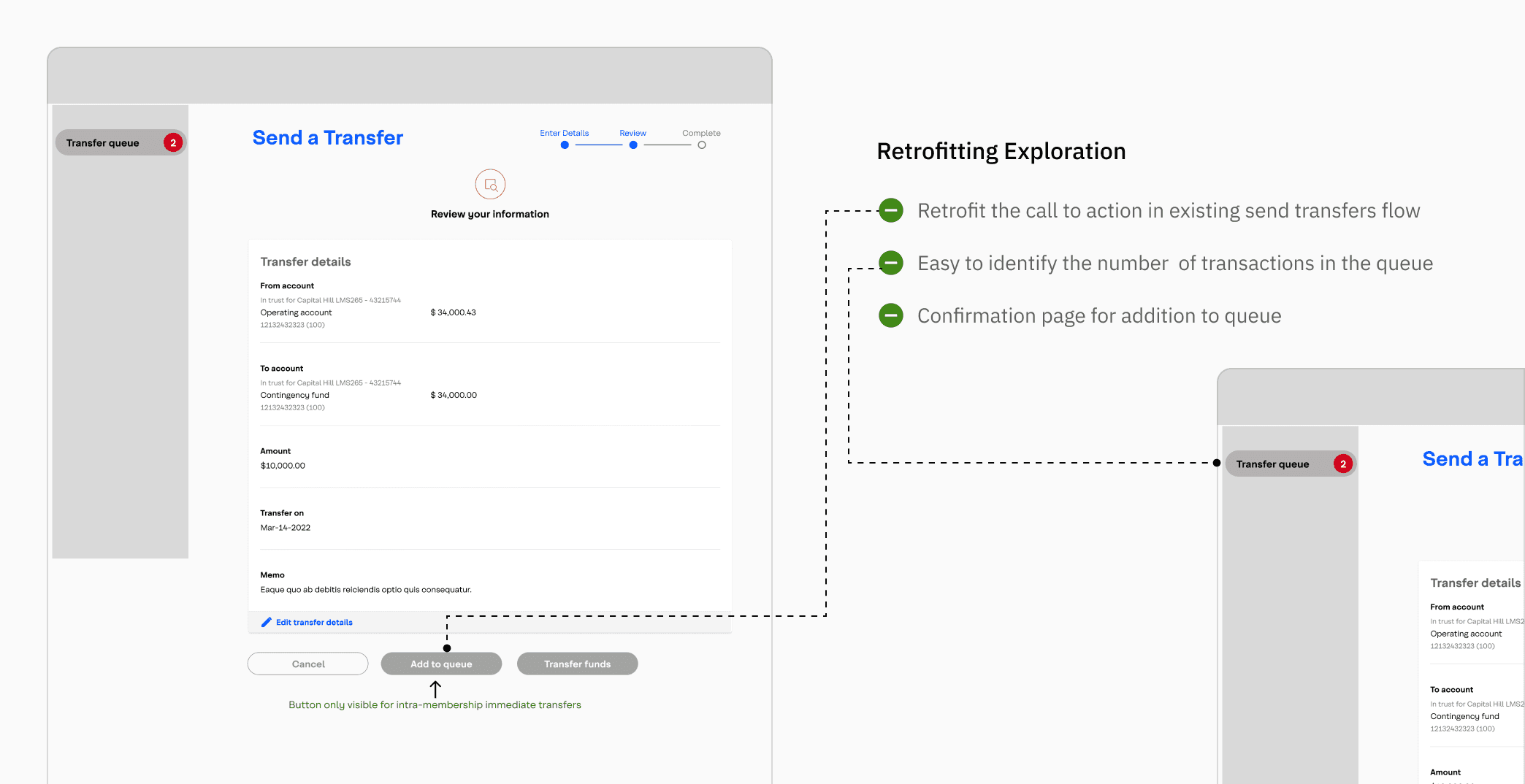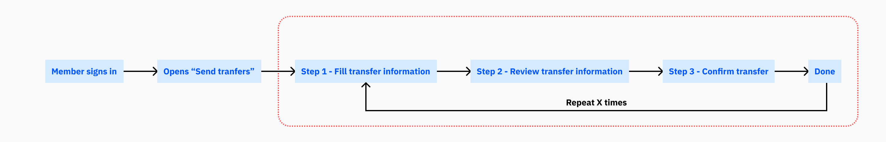 Designed an experience that allows the commercial members to add multiple transfers into a queue and save the list for recurring use.