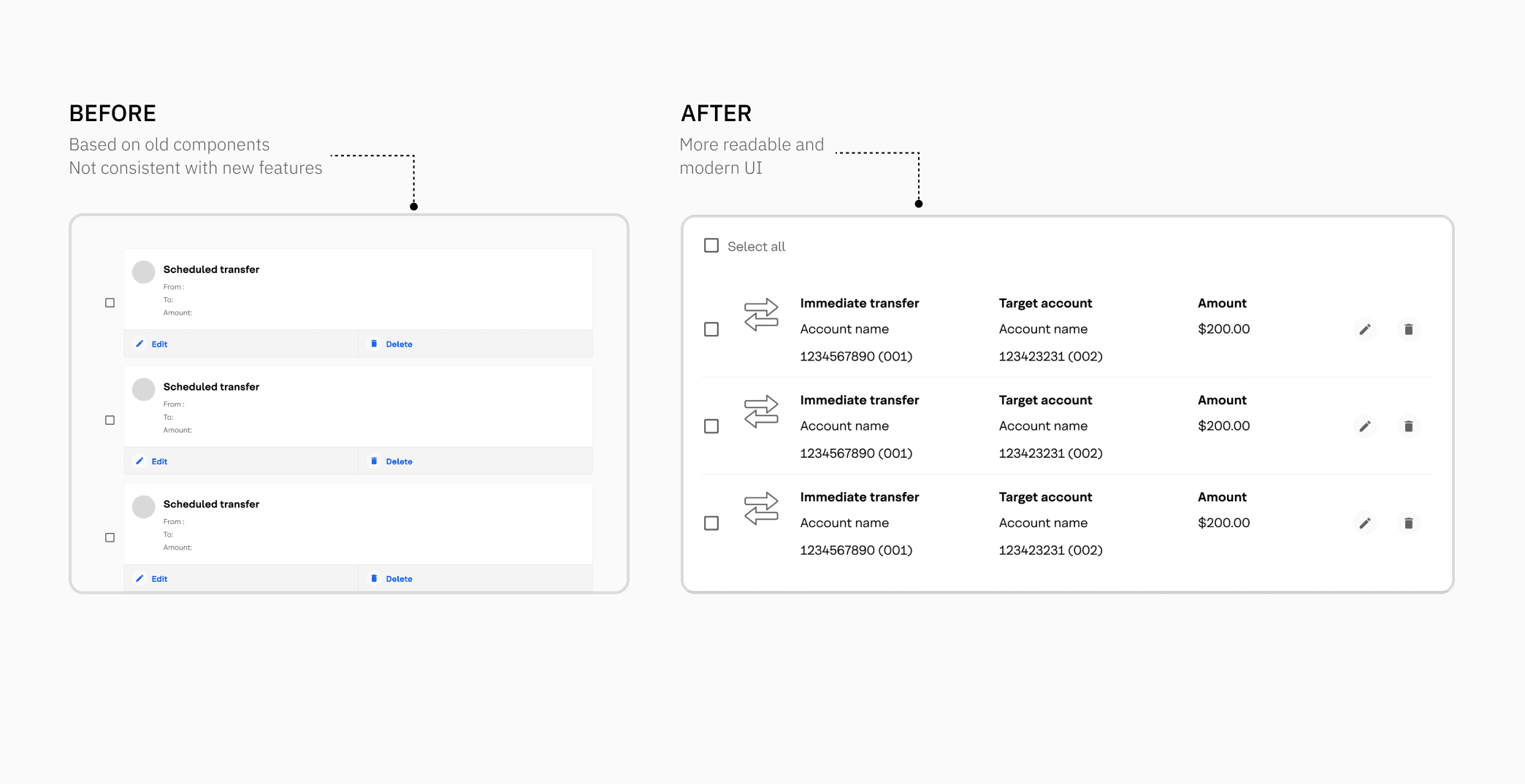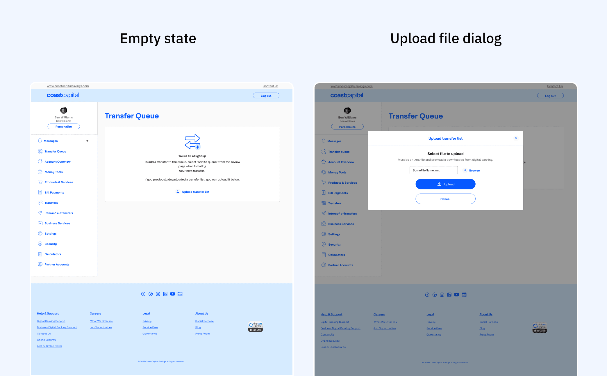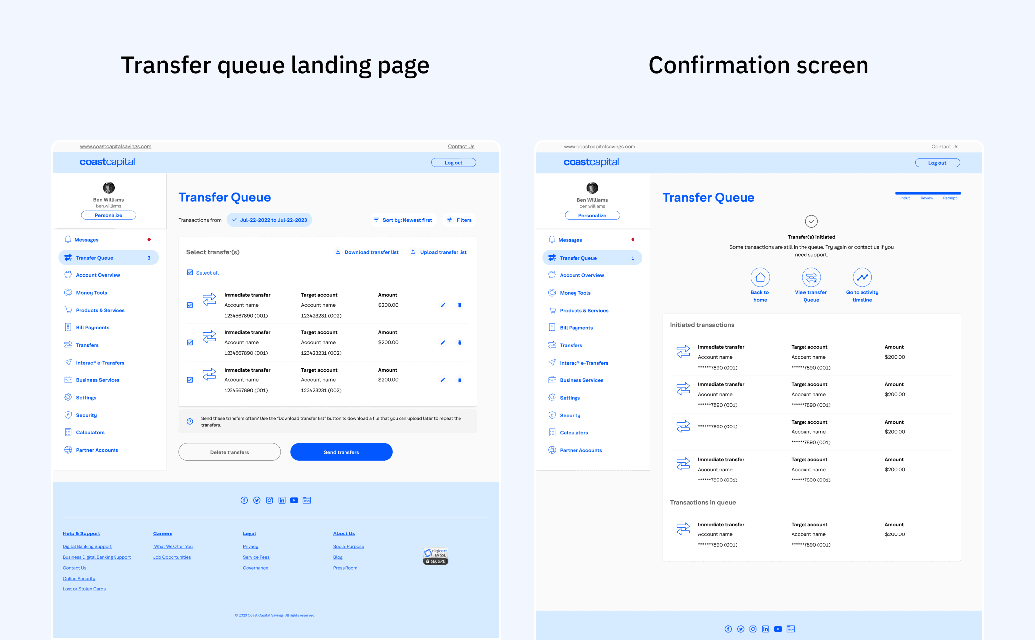 Designed an experience that allows the commercial members to add multiple transfers into a queue and save the list for recurring use.