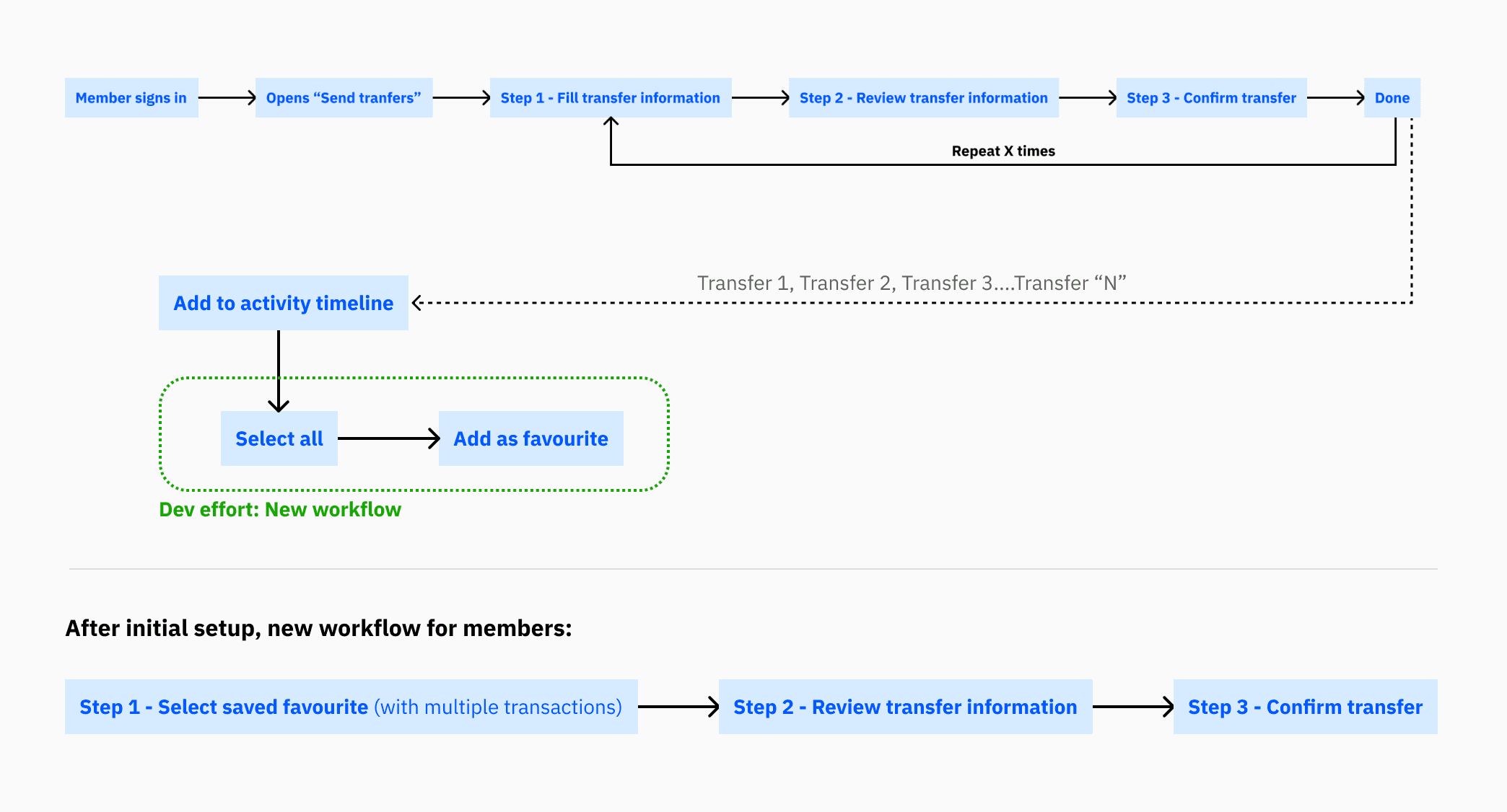 Favourites is an existing functionality that can be utilised to save these transfers. The user flow can be updated to include that functionality while keeping development cost and effort low.